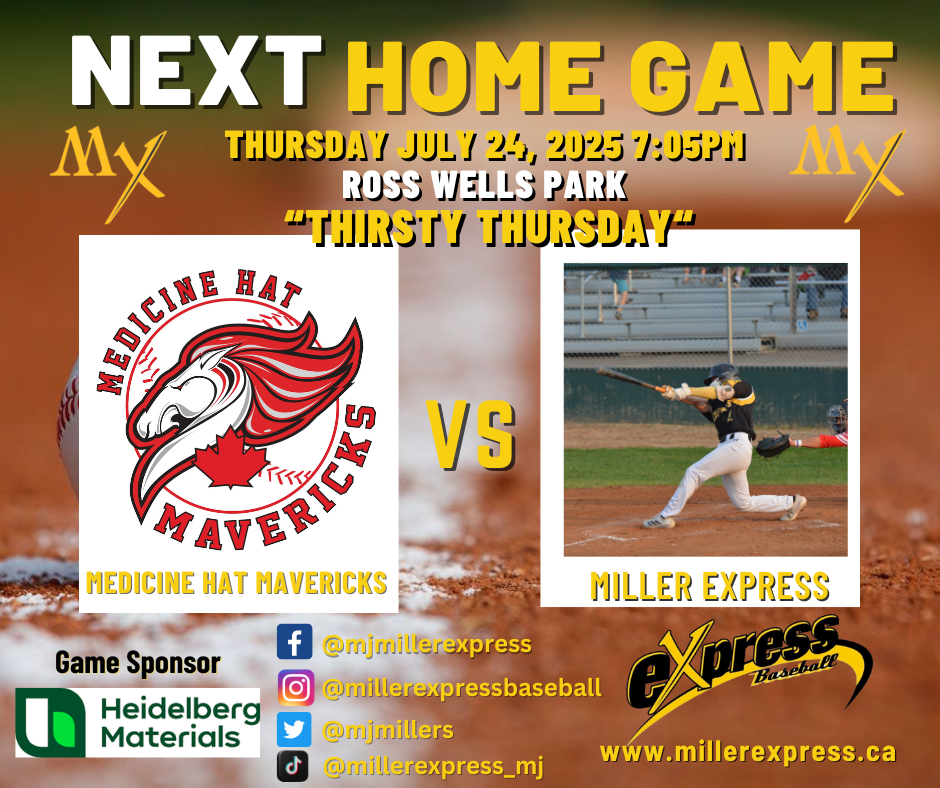 The Moose Jaw Miller Express return to Ross Wells Park tonight to take on the Medicine Hat Mavericks in what promises to be a thrilling WCBL showdown. First pitch is scheduled for 7:05 PM, with the game proudly presented by Heidelberg Materials, Concrete.