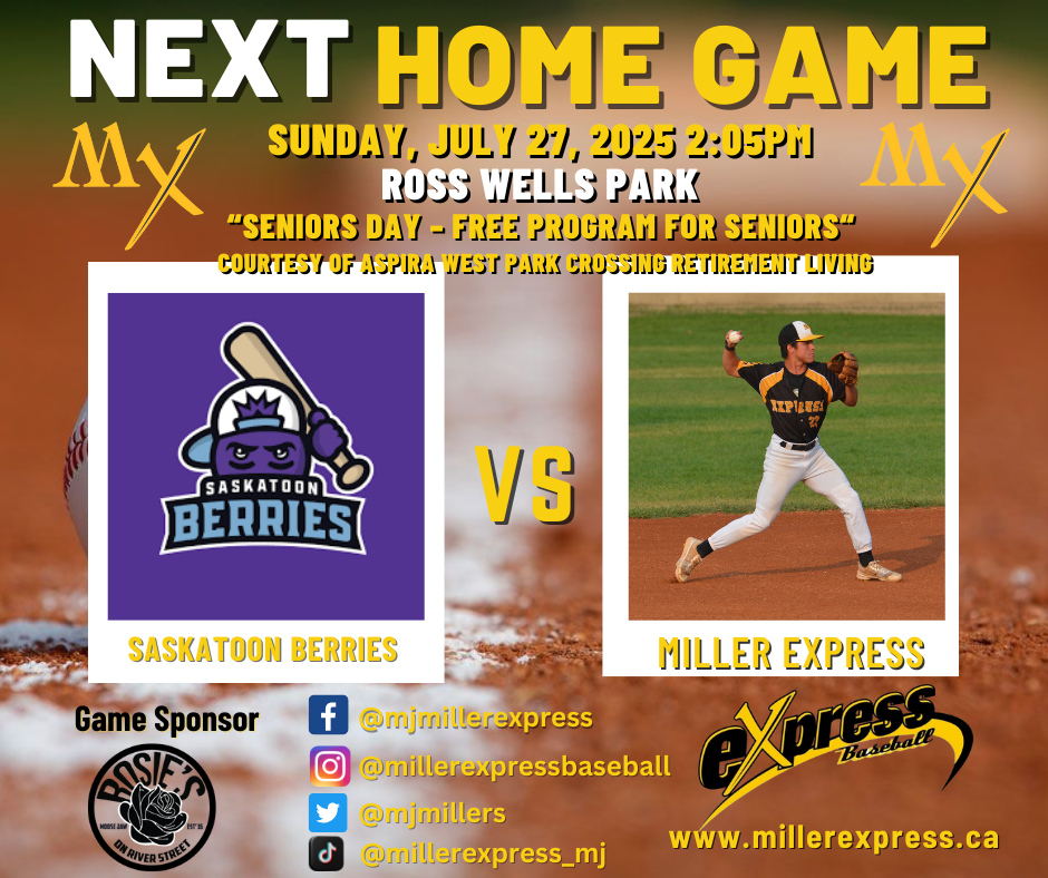 It’s Seniors Day at Ross Wells Park as the Moose Jaw Miller Express (48 GP, .291 team AVG) gear up for an exciting afternoon matchup against the Saskatoon Berries.
