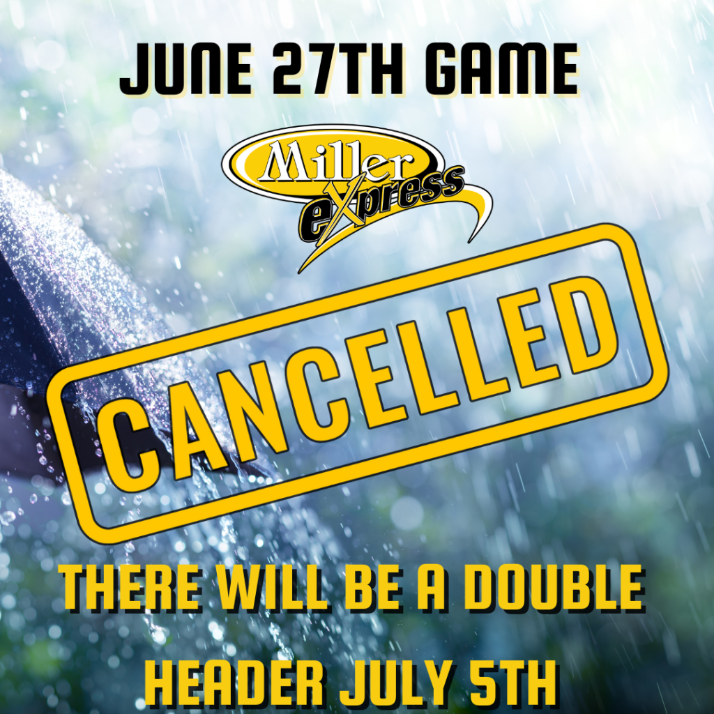 The June 27th Game has been postponed due to weather. A double header will take place on July 5th with the first game doing at 6pm .