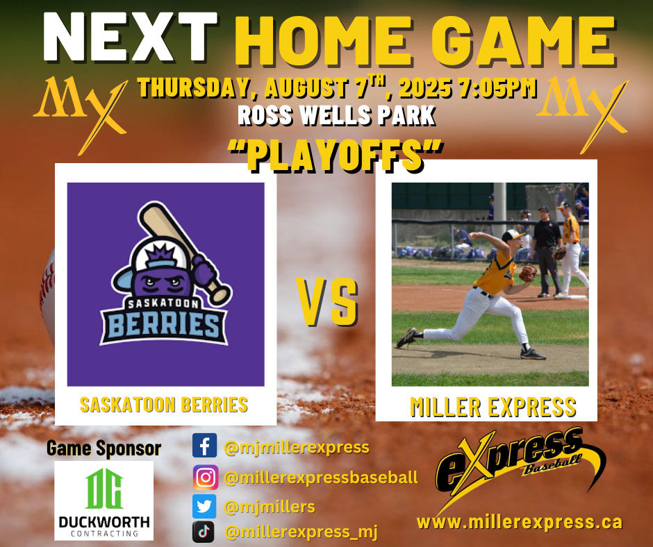 The Moose Jaw Miller Express opened their playoff run with a 6–4 win over the Saskatoon Berries at Nex Gen Patch @ Cairns Field in Saskatoon on August 6, 2025. The win gives Moose Jaw a 1–0 series lead as they look to carry the momentum forward.