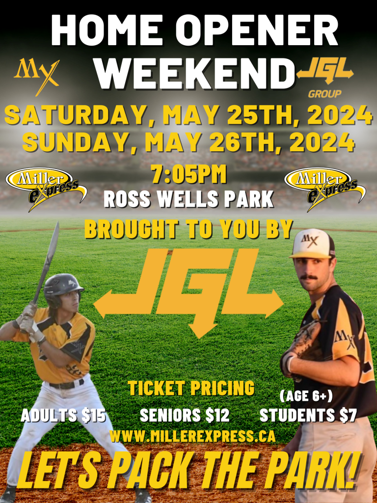 Get ready for a thrilling weekend of baseball as the Moose Jaw Miller Express kick off their season with a bang! Thanks to the generous support of the JGL Group, we are excited to bring you an unforgettable Home Opener Weekend filled with fun, excitement, and community spirit.