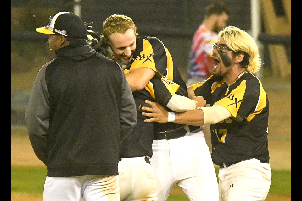 “We know (Okotoks reliever Ashton Leura) throws hard, and it’s tough with the lights out here, too, so it makes it extra hard, but I was just trying to jump on a fastball,” Pokorney said in describing his at-bat. “I just happened to get one over the plate and got good hands on it… It was electric, man. We put our heart and soul into this MX jersey right here and there’s no better feeling than getting a hit like that for the boys.”