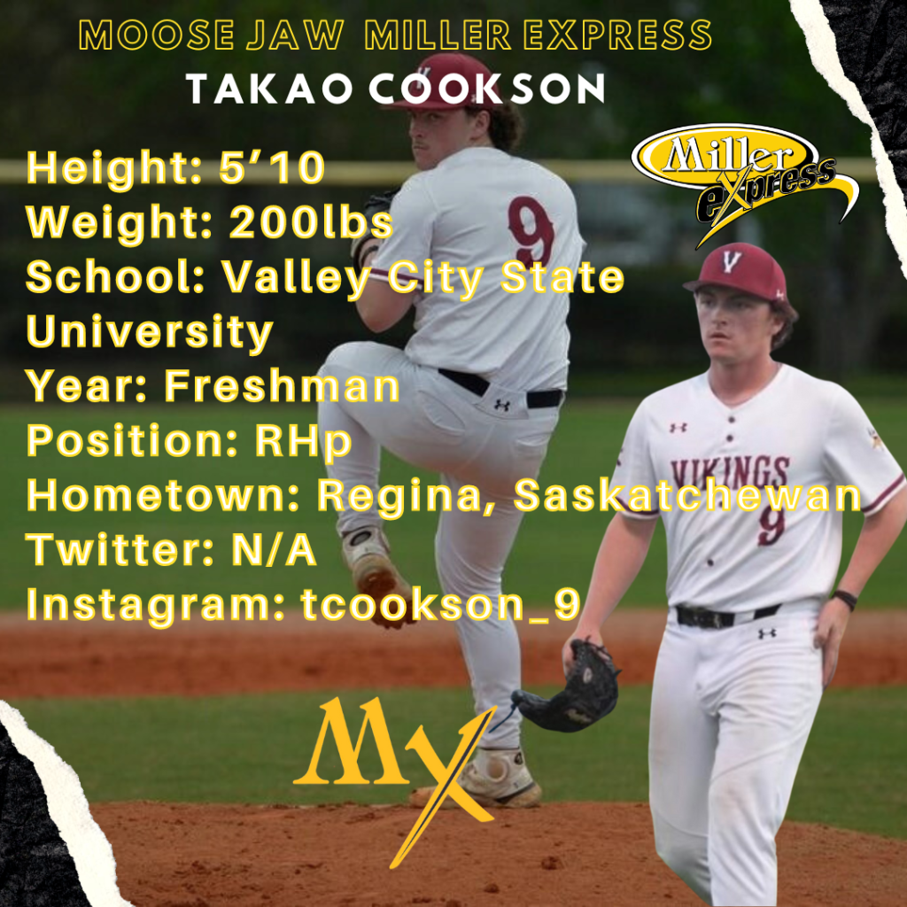 PLAYER SIGNINGWe have signed local Regina, Saskatchewan native Takao Cookson to our roster for the 2024 season. The 5’10, 200lb righty joins us from Valley City State University. Welcome to Moose Jaw, Cookie!